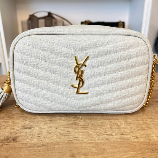 Saint Laurent YSL Matelasse Monogram Mini Lou Camera Bag White and Gold Hardware