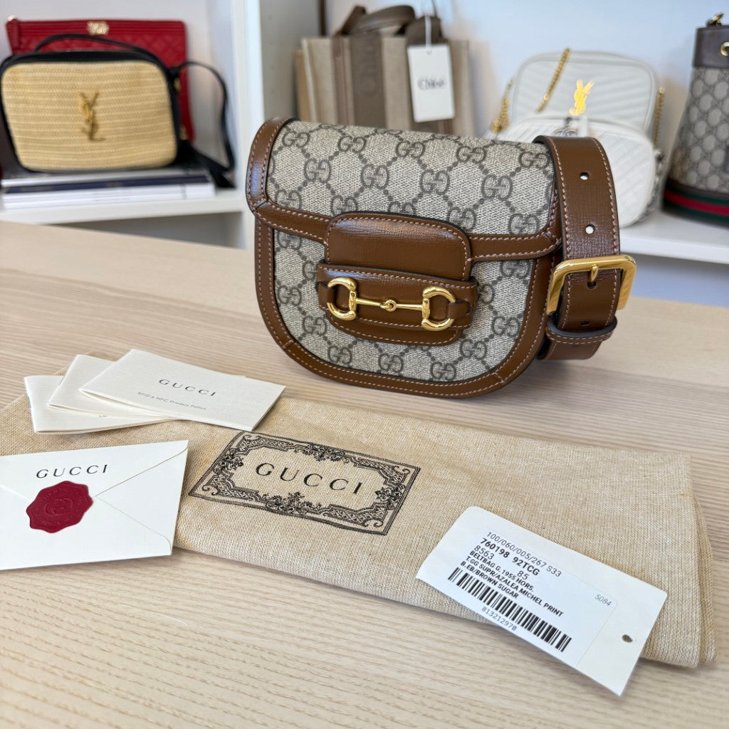 Gucci GG Supreme Monogram Mini Horsebit 1955 Rounded Shoulder Bag Beige Brown Sugar