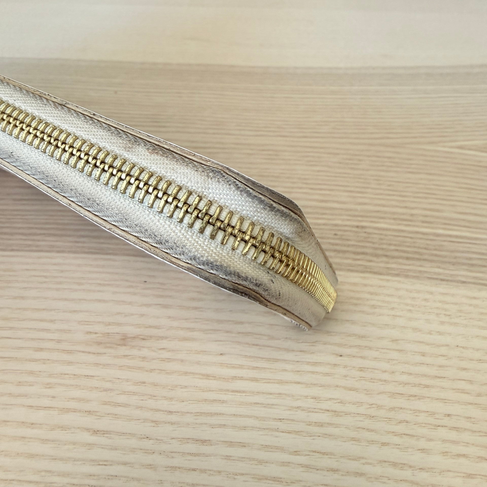 Description: Moderate wear on exterior. Light canvas wear on exterior with marks as pictured. Moderate rubbing wear. Interior marks as pictured. Moderate tarnishing. Moderate glazing wear. Inside is for the most part clean. Lots of life left still on this gorgeous wallet!