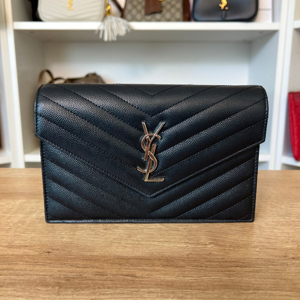 Saint Laurent YSL Grain De Poudre Matelasse Chevron Monogram Envelope Chain Wallet Black